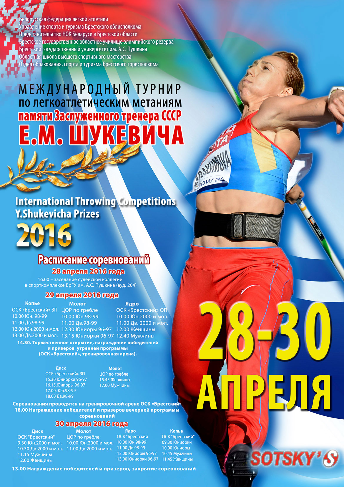 Международный турнир по легкоатлетическим метаниям памяти Заслуженного тренера СССР Евгения Шукевича (International Throwing Competitions.Y.Shukevicha Prizes) стартует в Бресте 28 апреля. Открытие турнира и награждение победителей утренней сессии пройдет на стадионе «Брестский» 29 апреля в 14.30.