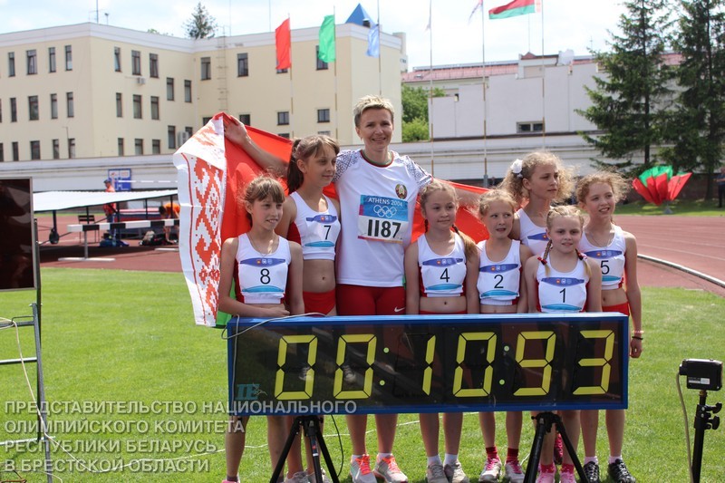 Свою золотую стометровку прославленная чемпионка пробежала вместе с юными бегуньями – учащимися областной СДЮШОР. Примечательно, что на Юлии был именно тот, афинский номер. На финише спортсменку ждал флаг Беларуси, который был на плечах спортсменки в 2004 году.