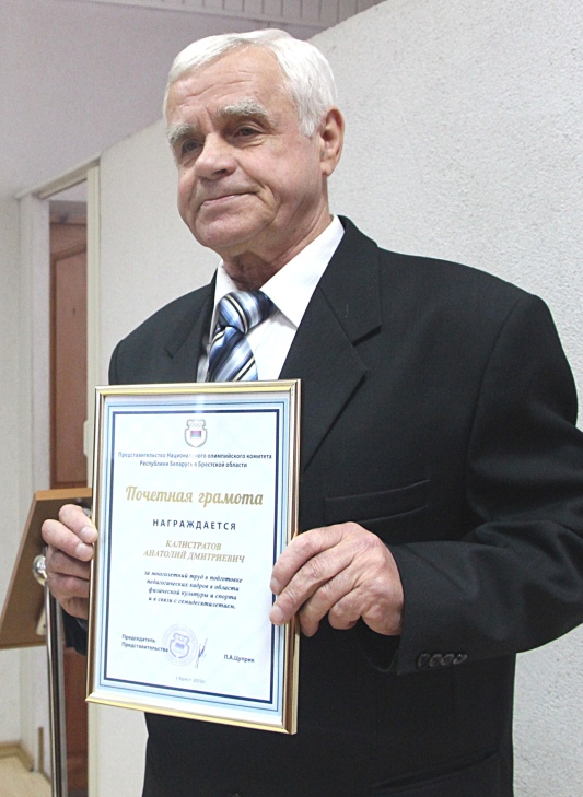 Почетная грамота Представительства НОК вручена сотруднику университета На Совете Брестского государственного университета имени Пушкина (http://www.brsu.by/) ректор Анна Сердер вручила Почётную грамоту Представительства НОК Беларуси в Брестской области лаборанту кафедры спортивных дисциплин факультета физического воспитания Анатолию Дмитриевичу Калистратову. Награда вручена за многолетний труд в подготовке педагогических кадров в области физической культуры и спорта и в связи с семидесятилетием.